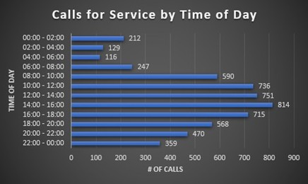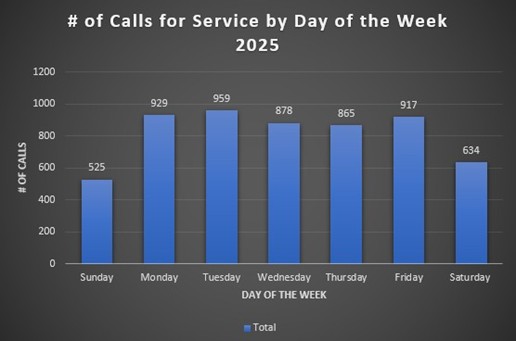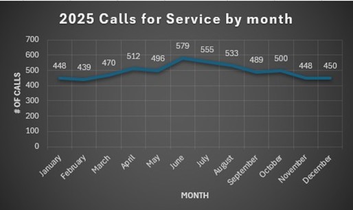 In 2025, North Park Police Department handled 5,906 calls for service. A call for service is generated by Logan 911 Communication Center when a citizen calls into Dispatch and requests help from an officer. Calls for service can also be generated by the department for specific cases as the need arises. Examples include cases involving sexual assaults, burglaries, or other in-depth investigations. Below is a breakdown of calls per month, day of week, and time of day.
